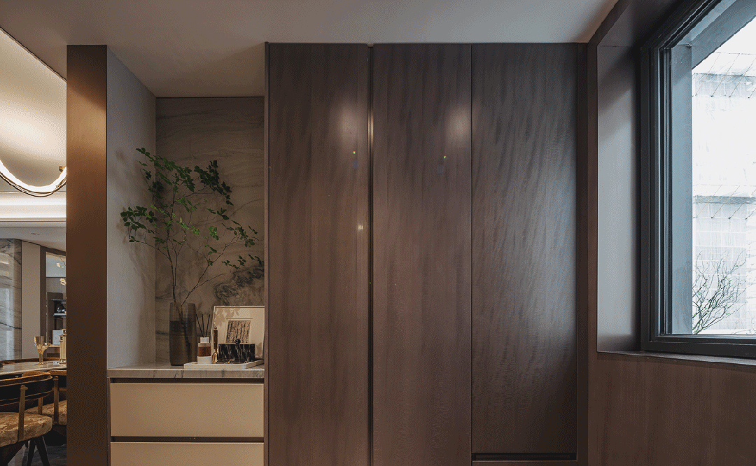 吊顶、餐边柜台面、卫生间台盆等多处圆弧设计,一方面是东方弧度美学,另一方面也是考虑儿童友好,避免磕碰的人性化设计。
