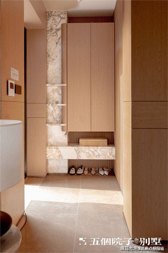超大空间入户玄关,可以在保证了业主私密性的同时定制一排柜子,更好增加室内的储物。